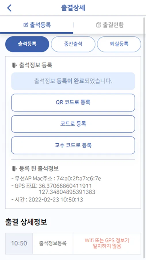 - 학생의 학기 별 수강 시간표 조회 및 출결 현황을 조회할 수 있습니다.