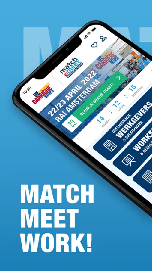 Installeer de App en geef je carrière een boost met het gratis bezoeken van het grootste carrière evenement van Nederland én het aanmaken van een Match&Meet profiel.