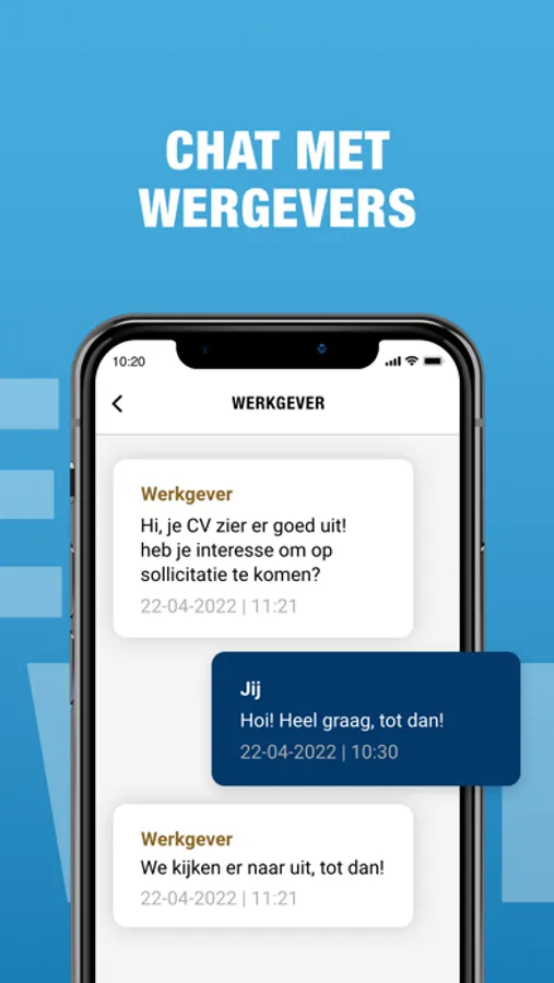 Na het aanmaken van je Match&Meet profiel in deze App, kun je zien met welke deelnemende werkgevers & opleidingen op de beurs je een match hebt. De matchende exposanten kunnen je voorafgaand aan de beurs al uitnodigen voor een eerste kennismakingsgesprek! Ook krijg je met een Match&Meet profiel de beschikking over de actuele beursplattegrond en krijg je de mogelijkheid om te chatten met de deelnemende werkgevers en opleidingen. Ander voordeel: na het aanmaken van je profiel kun je heel handig met de favorieten functie je eigen beursprogramma samenstellen!