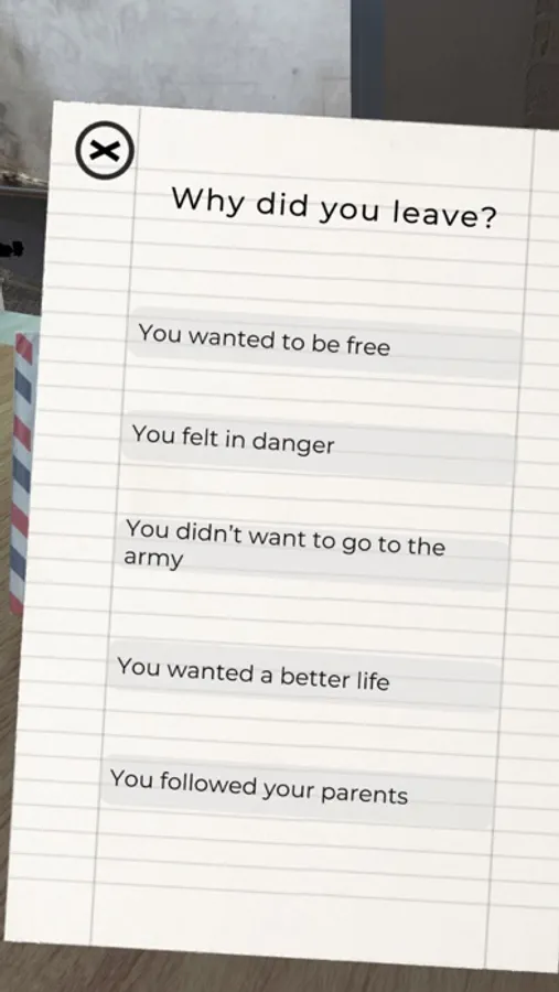 Die Stimmen der verschiedenen Charaktere lassen den Besucher in ihre Erfahrungen und Emotionen eintauchen und werfen die Fragen auf: Warum bist du gegangen? Was haben Sie mitgenommen? Wen hast du zurückgelassen? Wohin bist du zuerst gegangen? Wie fühlst du dich? Die Wahl der Antwort aktiviert eine der Geschichten, die die schwierigen Zeiten, den Prozess des Verlassens der Heimat und die Anpassung an den neuen Ort aufzeigen.