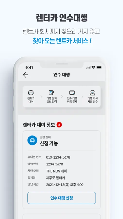 기사님이 빌린 렌트카를 대신 인수하여 제주시내 원하는 장소 (공항, 항만, 호텔)까지 렌트카를 배달해드립니다.