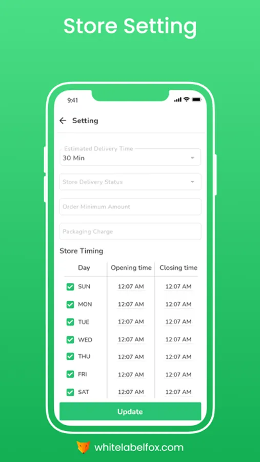 - Manage store settings like store time, delivery time, delivery radios, min order amount, packaging charge, store address