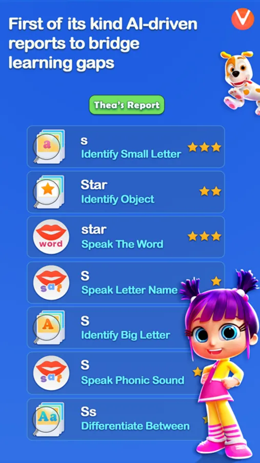 Our unique AI-driven reports bridge the learning gap to know where your child needs attention. You will know if a child faces a problem saying the letter name or identifying a letter.