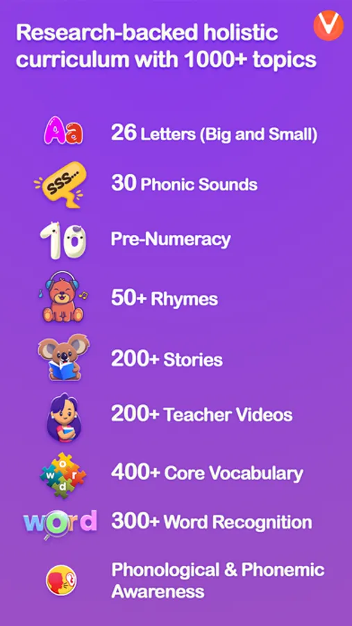 The curriculum includes 1000+ new words, Phonic sounds, Letter names, identifying big and small letters, various flashcards, rhymes, and graphical stories. Our speech AI feature enables kids to speak words, letter names and phonic sounds. All in just 15 mins a day, and that too they will learn independently.