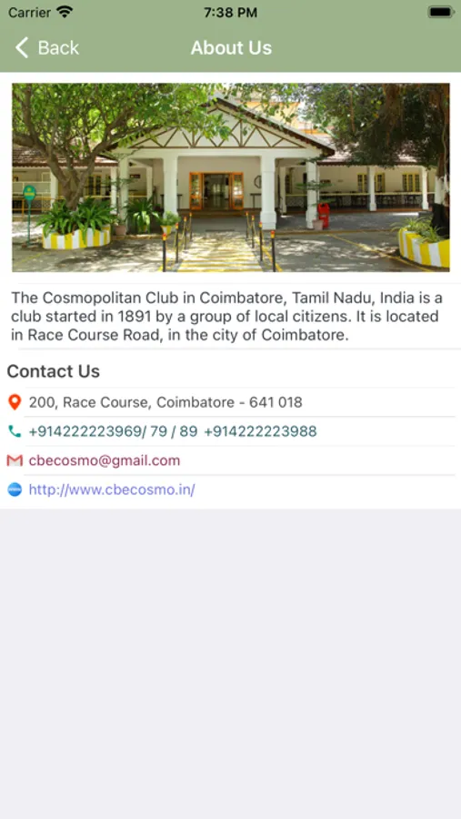 The Cosmopolitan Club in Coimbatore, Tamil Nadu, India is a club started in 1891 by a group of local citizens. It is located in Race Course Road, in the city of Coimbatore.The land for the club was purchased from Jayashree V.Murthy of Sulur on 25 July 1891. To an existing small shed, a clubhouse, a billiards room, card rooms and tennis courts were added. The front Porch was called Verandah club. A large tree in the vicinity was main meeting place of its members’ also called as Wisdom Tree.