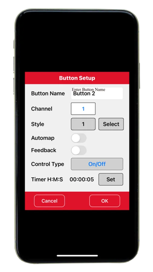 The Control PRO app provides advanced functionality features which enables the user to setup and create their own transmitter with a button setup area where you can select different button styles, auto map buttons, set timed outputs, as well as setting up an acknowledgement and change the control types to either momentary or latching.