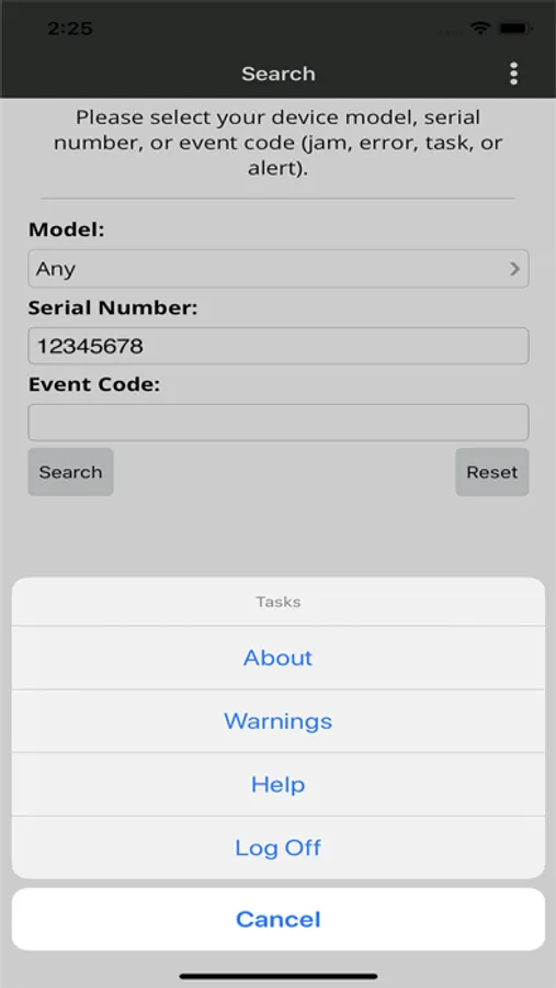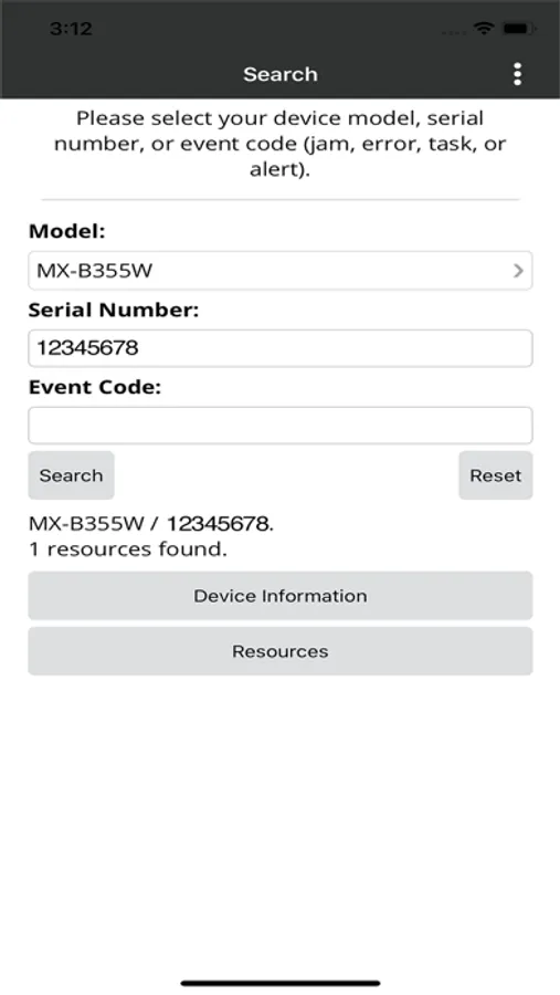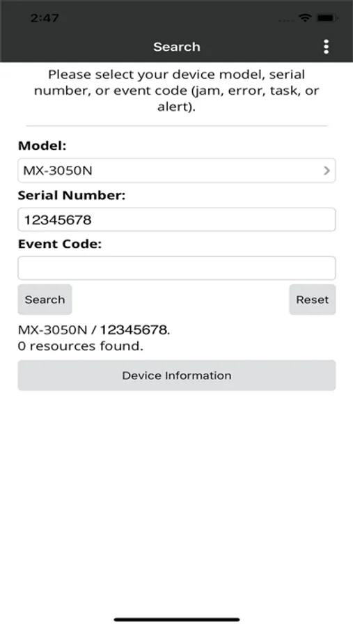 • Enter the MFP model, serial number, or event code (jam, error, task, or alert)