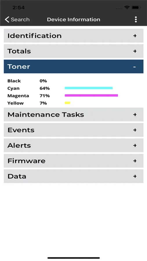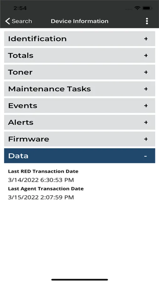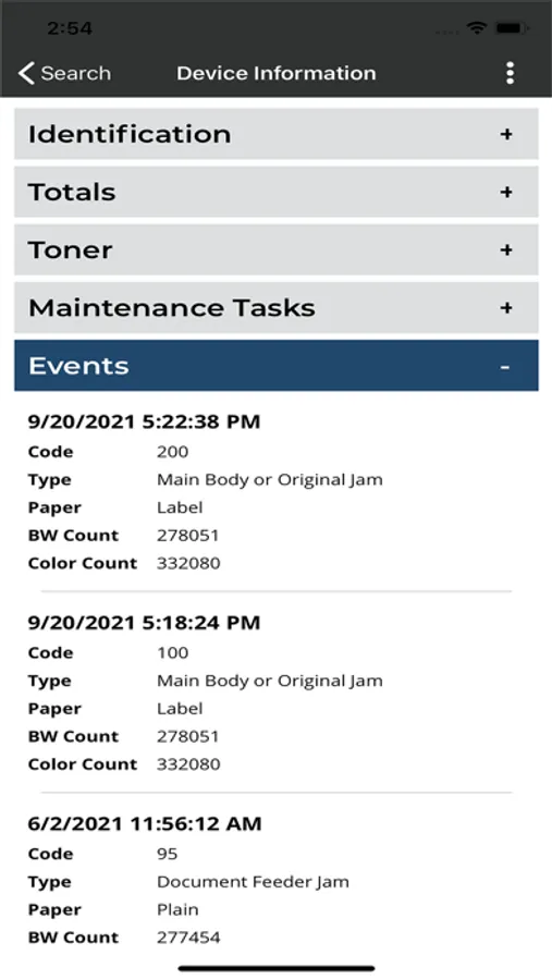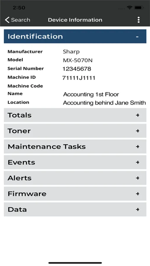 Once technicians enter the MFP serial number into the app, they receive immediate access to specific machine data, including: