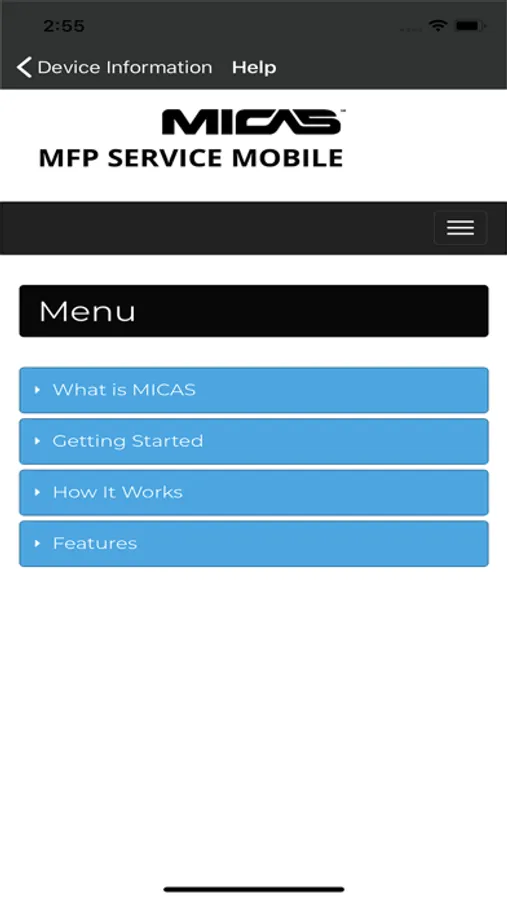 The MICAS (Machine Intelligence Call Assistance Service) mobile app is a one-of-a kind self-help system that collects machine data and allows MFP service technicians to bring a library of resources with them to service calls.