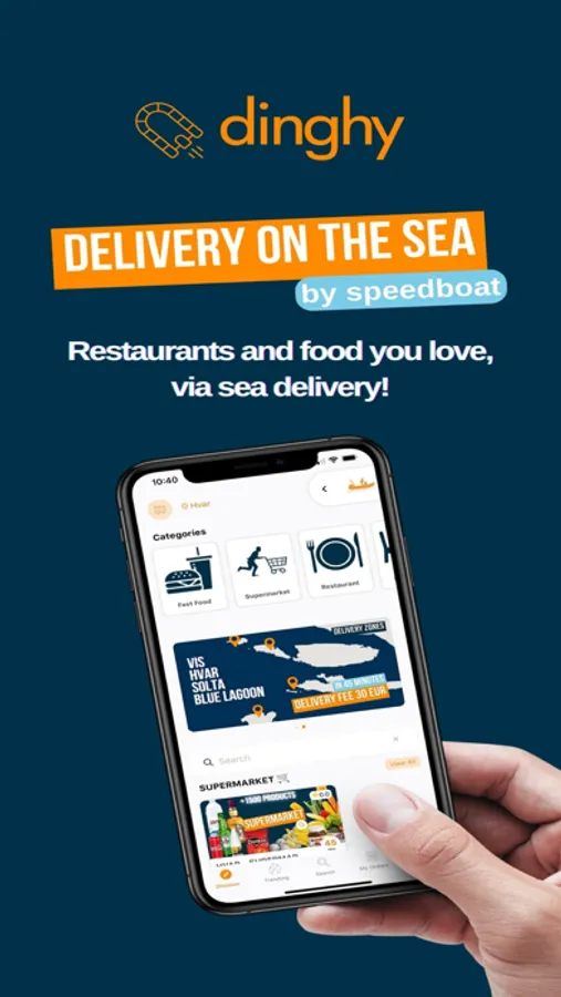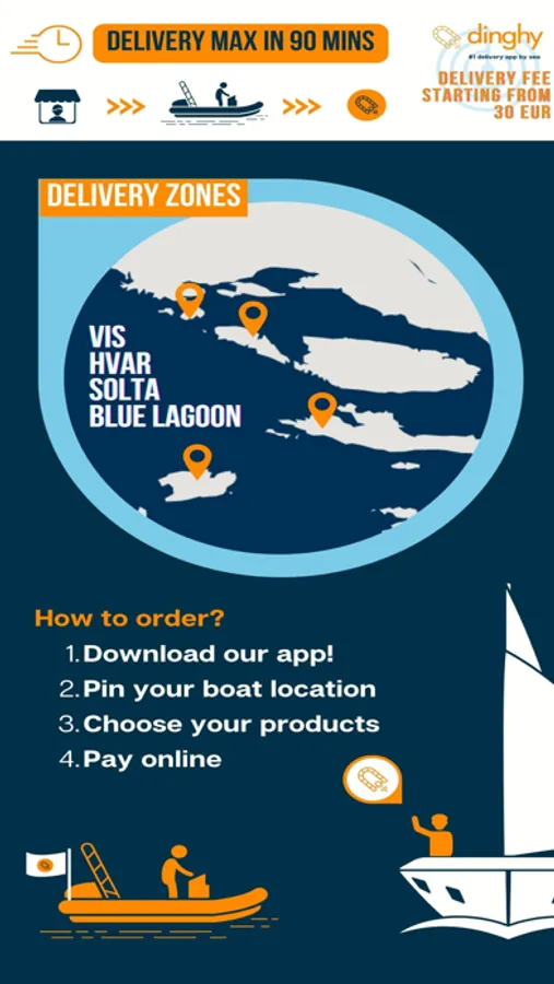 Dinghy is the most recent service of the sea delivery company. Dinghy is here to challenge the efficiency of the food delivery industry on sea all over the world, while helping the local merchants get more orders and increase the business efficiency.