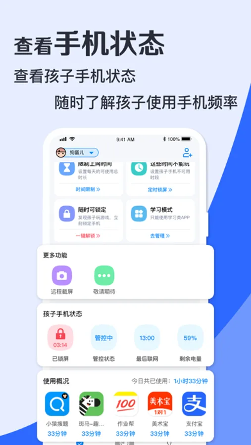 1. 【屏幕监管】:孩子使用手机学习时,后台自动捕捉手机界面,您无须实时看护, 即可轻松掌握孩子玩机动态