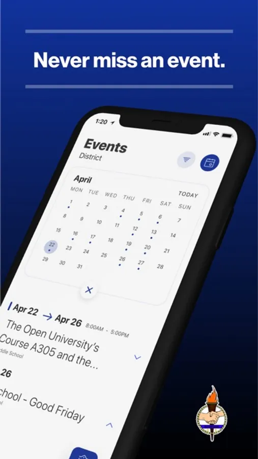 The event section shows a list of events throughout the district. Users can add an event to your calendar to share the event with friends and family with one tap.