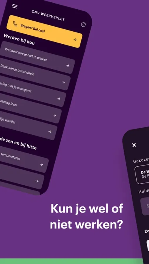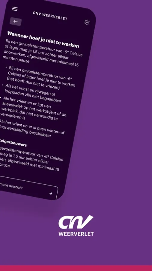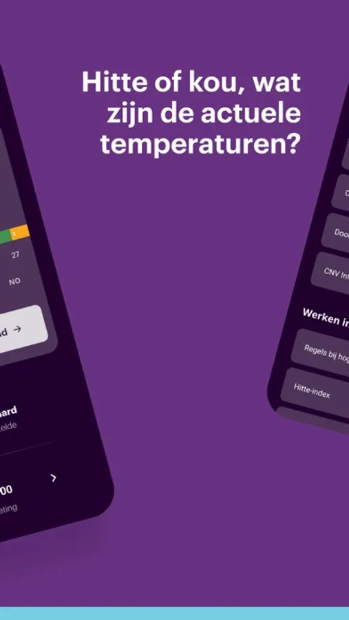 Hitte of kou, wat zijn de actuele temperaturen en kun je wel of niet werken? In de nieuwe weerverlet app van CNV Vakmensen vind je alle informatie die voor jou van belang is. Download de app nu.