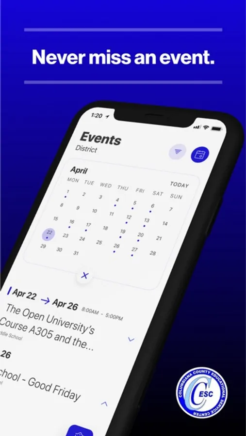 The event section shows a list of events throughout the district. Users can add an event to their calendar to share the event with friends and family with one tap.