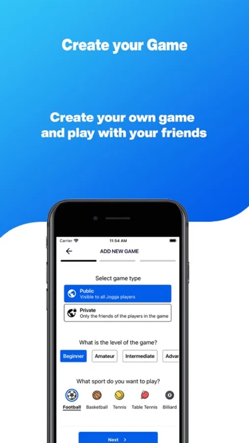 Available sports: football, basketball, tennis, table tennis, billiard or bowling. But we intend to add more.