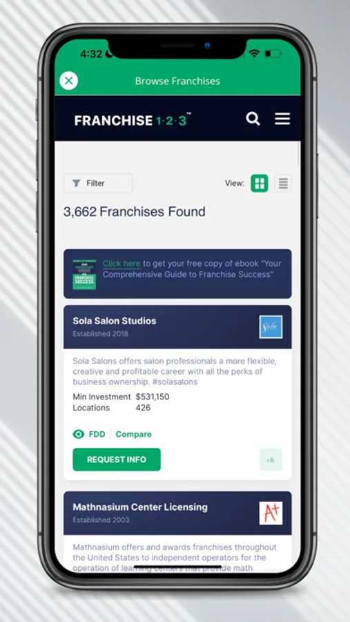 Franchise123™ will help you narrow down your investment options, compare franchises side by side, view FDDs for free, and get started with the discovery process without having to jump through any unnecessary hoops.