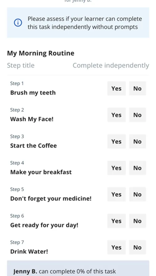 avail® builds confidence, independence, and skills training among individuals through repetition; accelerates milestones by providing virtual reassurance; and frees up the capacity of staff with remote support, allowing more individuals to be served. The interactive platform simplifies task analysis with built-in assessment analytics, augmenting one-to-one skills training using step-by-step instruction using digital prompts and arming schools and organizations with the tools to effectively track progress, decrease waitlists, and enable individuals to achieve independence.