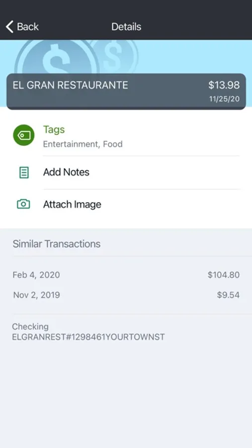- Keep your transactions organized by allowing you to add tags, notes and photos of receipts and checks.