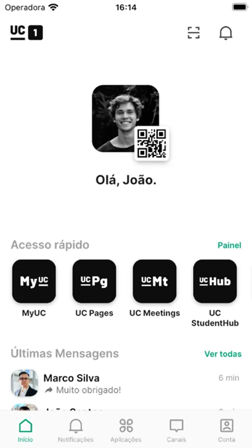 UC One is a super-app that allows the centralization and efficient management of services, such as notifications of the multiple platforms, quick access to conversational channels, and identification of the user in the access to spaces and/or activities in the University of Coimbra.
