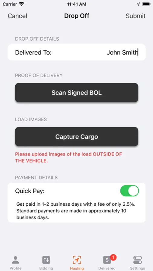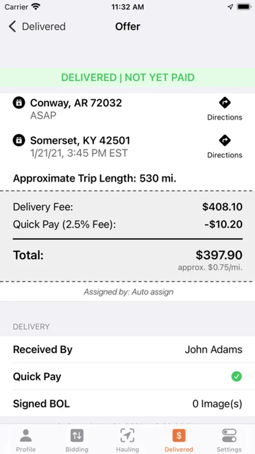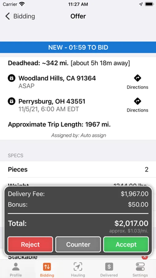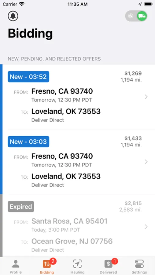 After you're approved and authorized, the dispatch will send you the best loads available in your vicinity and you'll be able to make a bid, accept or reject it!