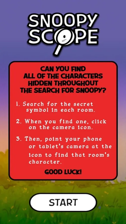 The Search for Snoopy SnoopyScope app is the official augmented reality companion app to The Search for Snoopy - A Peanuts Adventure. Use this application to solve the Snoopy Puzzle, and discover the seven hidden Snoopy alter egos found in rooms of The Search for Snoopy.