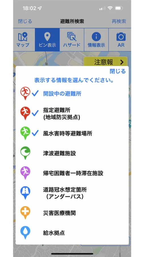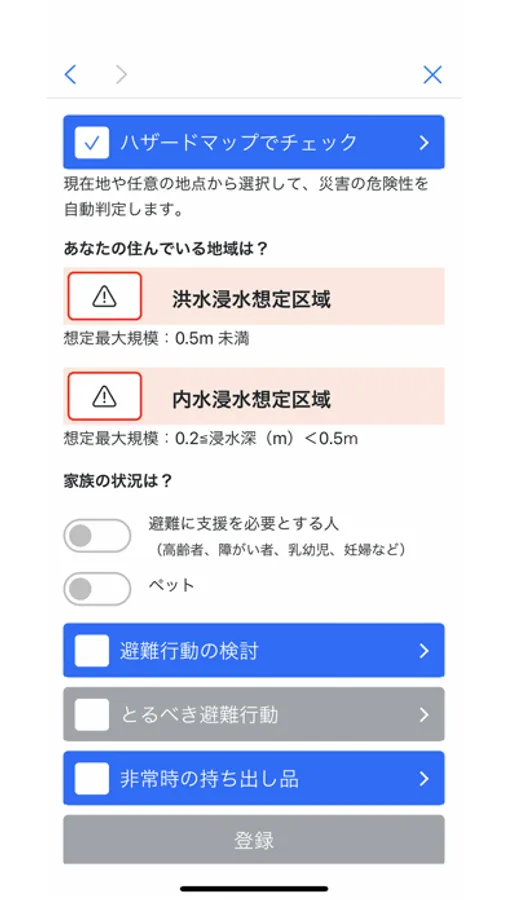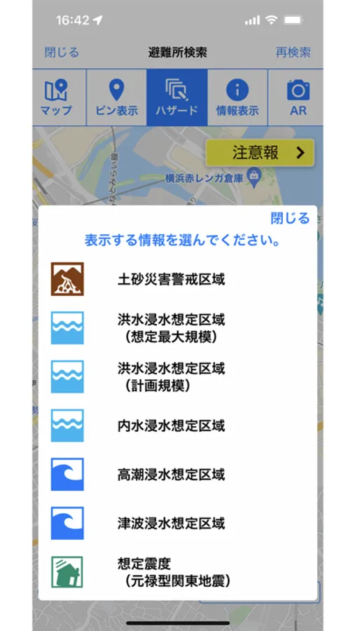 ・土砂災害警戒区域、浸水想定区域などのハザードマップ表示