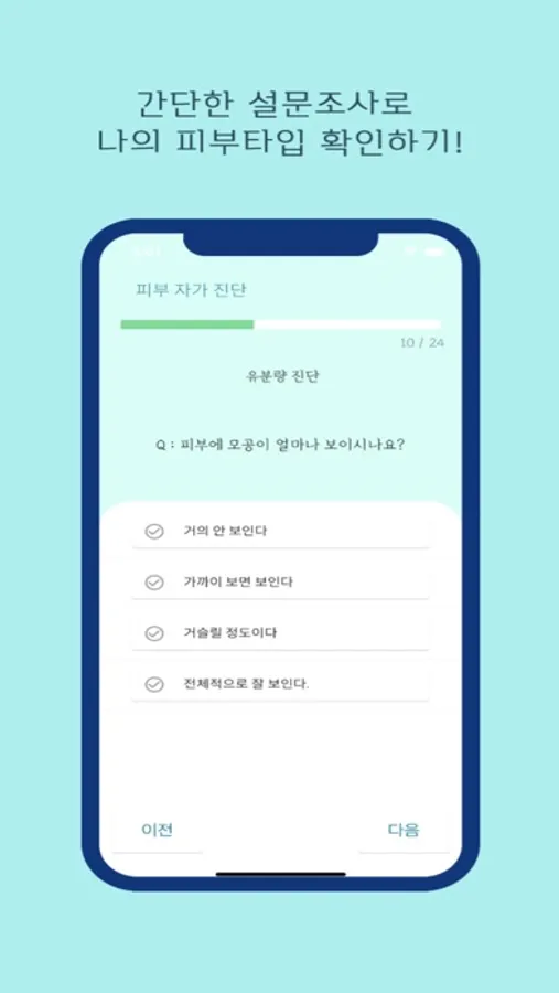 1. 간단한 피부 설문조사를 통해 당신의 피부를 Basup만의 288가지 피부타입로 분류합니다.