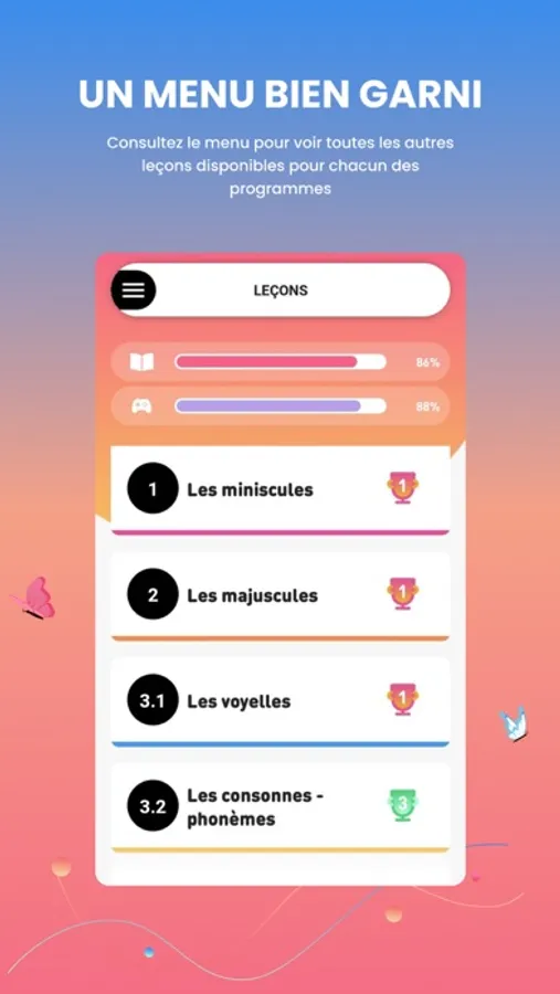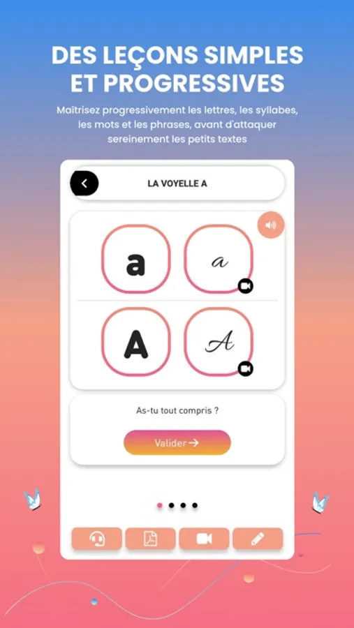 • Des leçons simples et progressives, commençant par l'alphabet jusqu’aux phrases, en passant par les syllabes et les mots.
