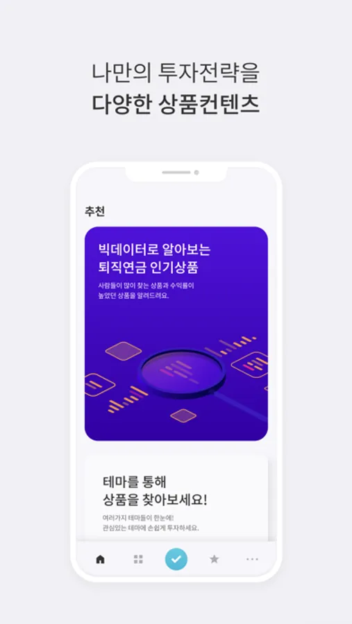 - 테마상품, 빅데이터 추천 상품, 로보 포트폴리오 등 퇴직금 운용에 도움이 되는 다양한 상품 컨텐츠를 제공합니다.