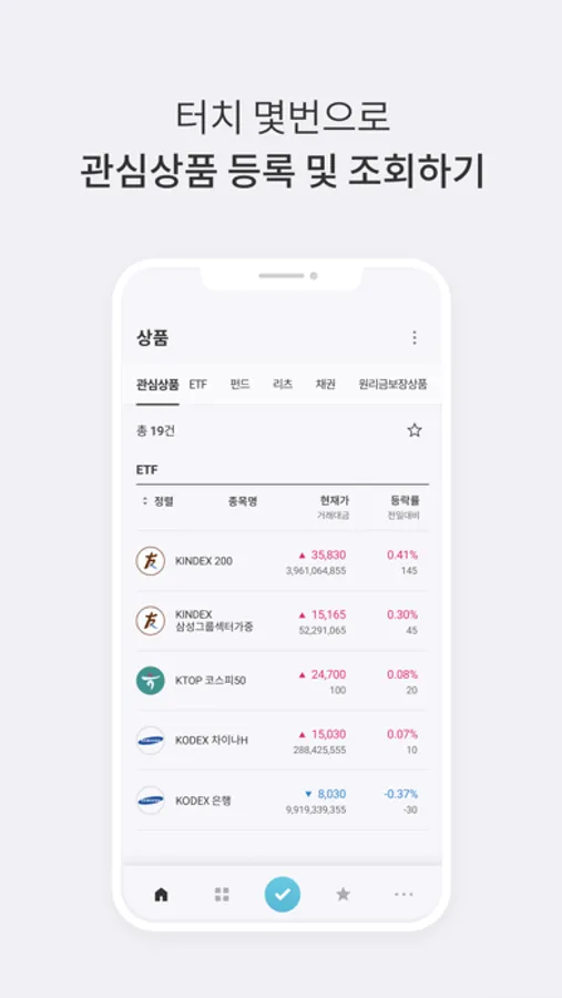- ETF/리츠, 펀드, 원리금보장상품 등 상품군별 조회로 원하는 상품을 간편하게 조회할 수 있습니다.