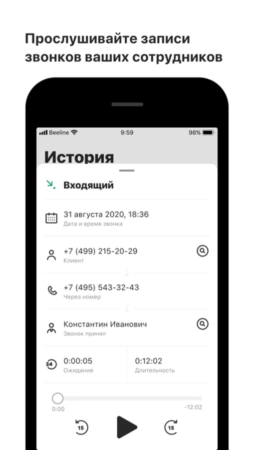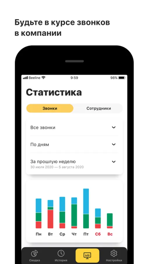 Установите мобильное приложение «Виртуальная АТС» Beeline Кыргызстан, введите логин и пароль от личного кабинета ВАТС и контролируйте звонки компании в режиме реального времени.