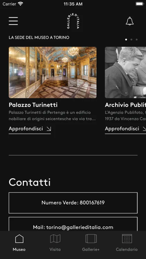 Gallerie d’Italia is the digital guide to the new Intesa Sanpaolo’s museum in Turin, which allows users to enjoy an "advanced" visitor experience: the user will be taken on an interactive journey to discover the Bank’s new cultural hub, Gallerie d’Italia – Torino, in an itinerary that ranges from temporary exhibitions of internationally renowned photographers to the history of the last century revealed through photographs stored in the Publifoto Archive and the permanent collection of Piedmont art housed on the Noble Floor.