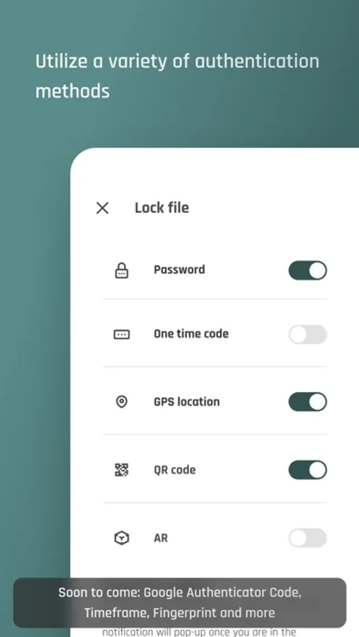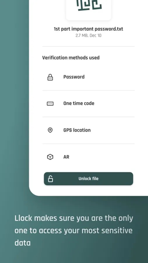 LLock enables you to take control of the protection level of your most sensitive data such as media, lines of code and valuable contacts. With Llock you can set the security level you need for your data - you can safeguard an individual file with one password or elevate the security level to the extreme by protecting the file with multiple authentication methods and hiding it from your smartphone.