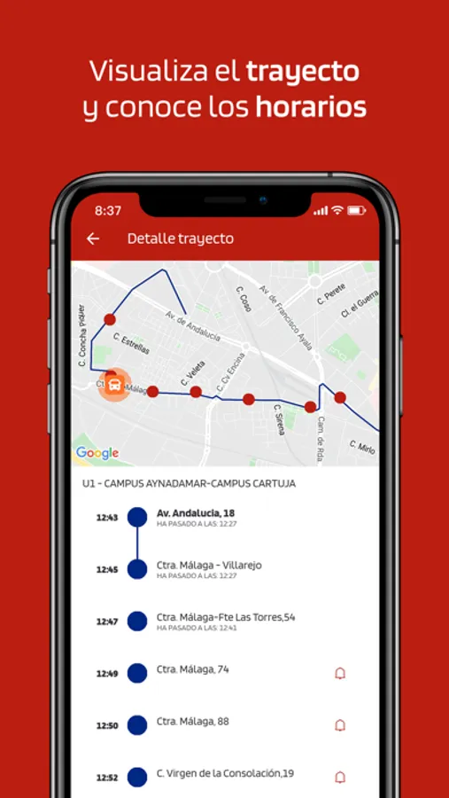 Localiza tu autobús y consulta durante el viaje por dónde va ¡En tiempo real!, sabiendo el momento en el que pasa por tu parada y perfecto para que quien te vaya a buscar esté informado del punto de espera con información de StreetView