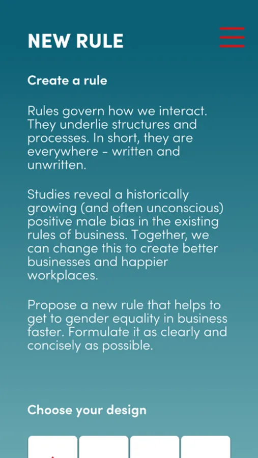In this App, you get the chance to rise to the top and become an “Ace of Business”. All you have to do is to propose at least one “New Rule” to re-design the corporate world in a gender equitable way – something we can only achieve together!