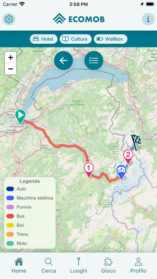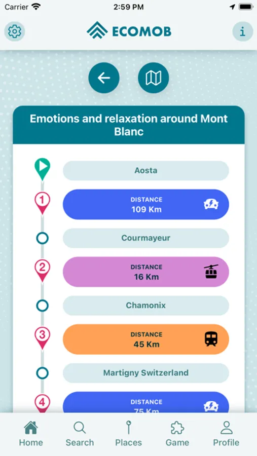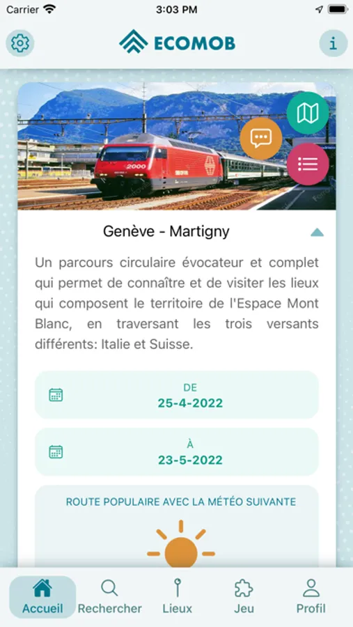 Multilingual mobile application to meet the sustainable mobility needs of tourists and citizens who want to discover and experience the Espace Mont Blanc area in an eco-sustainable way.