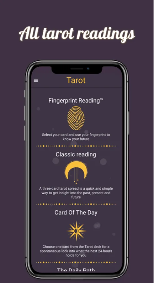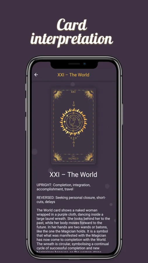 This Tarot reading app offers you many of the main Tarot readings, giving you a description of each card and interpreting them with our ancient fortune teller techniques to anticipate your future enlightening you and finding the daily motivation you need. Learn what each card of the arcana tarot deck means: the major arcana, the minor arcana, they're all here.