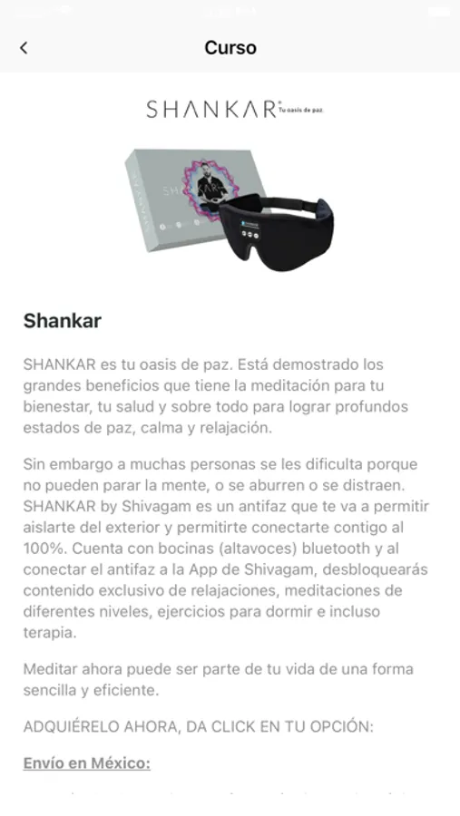 - Shankar es un producto físico el cual es una gafas que se usan para dormir, este producto se adquiere en un tienda física y donde dentro de la caja se obsequia un código de shankar para que esta persona puede acceder desde apps a audios gratuitos con los temas de meditación, o música para dormir.
