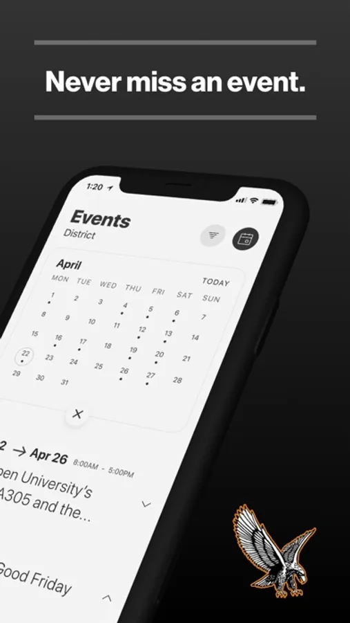 The event section shows a list of events throughout the district. Users can add an event to their calendar to share the event with friends and family with one tap.