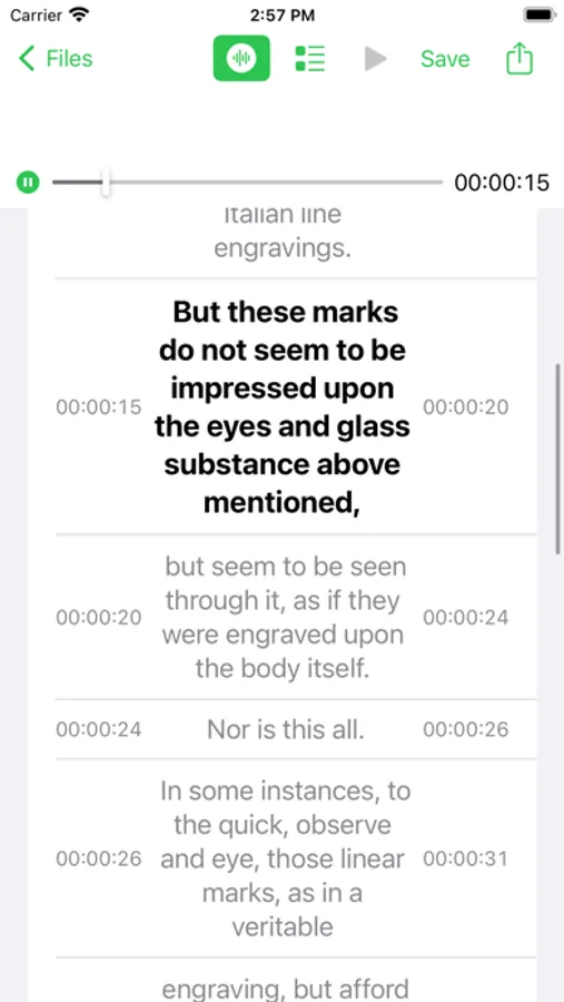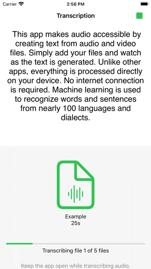 Readable Voice makes audio accessible. The app allows you to create text from audio or video, also known as transcription. Simply add your file and watch how the text is being created. Afterwards you can correct text errors directly in the app. Unlike other apps, everything is being processed right on your device. No internet connection is required. If you don't understand the language of the audio, the app can translate it for you as well. Machine learning is being used to recognize words and sentences of almost 100 languages and dialects.