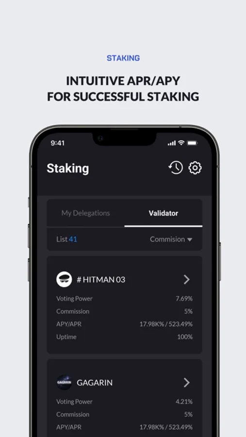 - Provides metrics that help users make wise investment decisions (APR / APY, Uptime, Self-Delegation etc.)