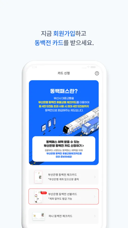 - 부산은행 전 영업점, 모바일앱에서 간편하게 동백전 카드를 신청할 수 있습니다.