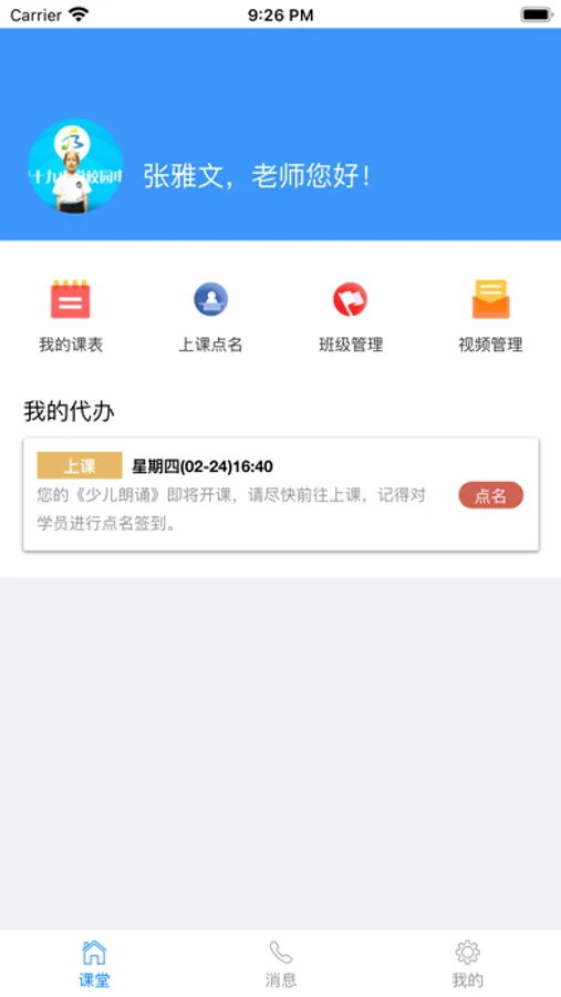 教师使用手机端系统,支持在线点名、在线查看学生情况(请假、出勤率等)。教师可以上传上课的视频信息到系统,方便学生查看教学视频(不会产生费用)。