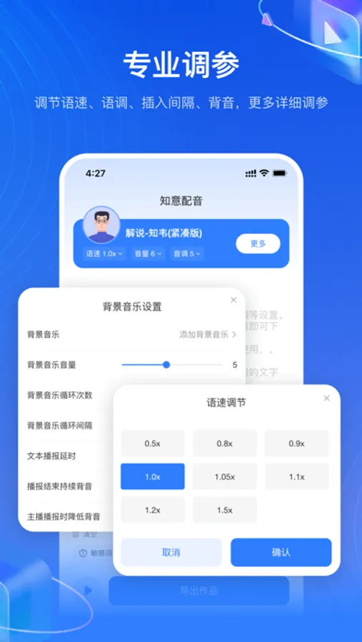 知意配音软件操作简单,只需将想要配音的文字粘贴至文本框。点击选择适合的主播,可选调节主播语速、语调、音量。支持查找多音字、查找违禁词,导出即可。导出时支持生成音频文件(mp3、wav)、支持生成视频文件(带字幕视频、不带字幕视频)、支持生成字幕文件(ass、srt)。5000字内的配音内容,3分钟内即可完成生产,高效便捷。