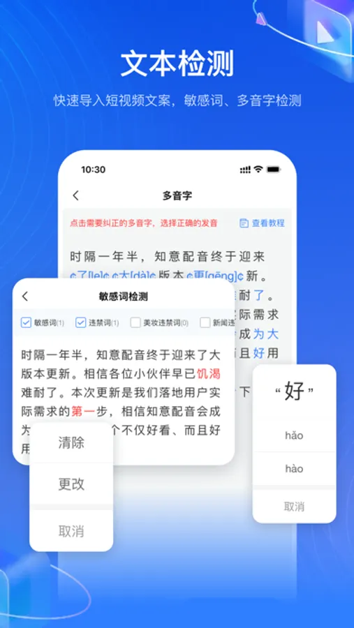 知意配音自上线以来,广受短视频创作者的喜爱,已拥有上百万用户,同时得到了各大短视频博主的倾力推荐。是短视频创作的必要效率生产工具。