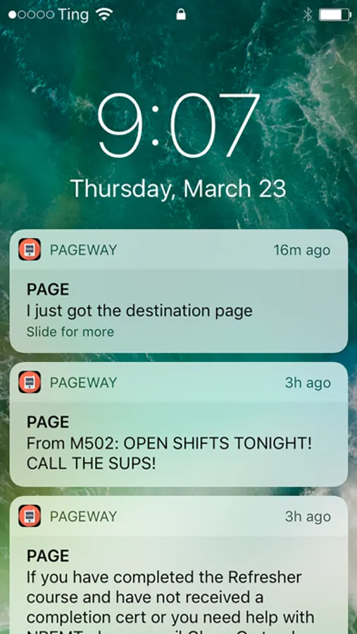 Pageway is a message receiver (virtual pager)* that is now available for iPhone/iPad and works using any available data connection. Receive and store messages separate from your SMS/MMS service. Addon as a feature to receive duplicates from your existing pager or SMS device.