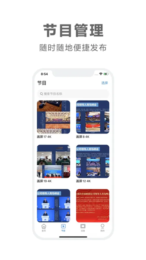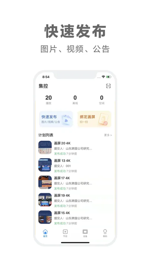 画屏集控是一款移动版轻量化信发系统,为商用画屏提供简单快捷的绑定方式,快速发布图片、视频、公告,便捷审核后台提交的计划,画屏轻松分组管理,远程控制