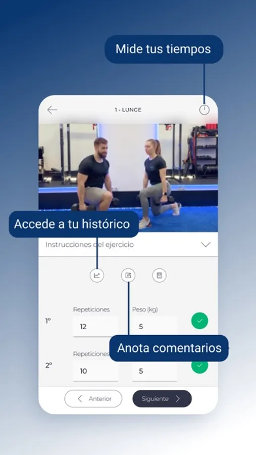 - Podrás ver los ejercicios que debes realizar con vídeos y explicaciones detalladas paso a paso.