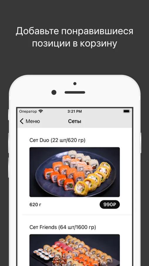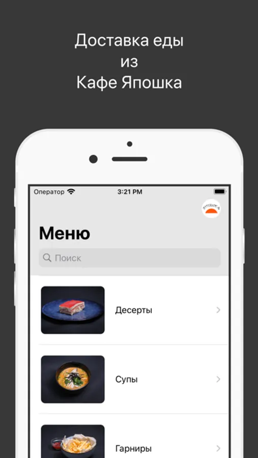 Как сделать заказ в приложении “КАФЕ ЯПОШКА”: выберите понравившиеся позиции из меню, добавьте их в корзину и перейдите на экран оформления заказа (по нажатию на иконку корзины).