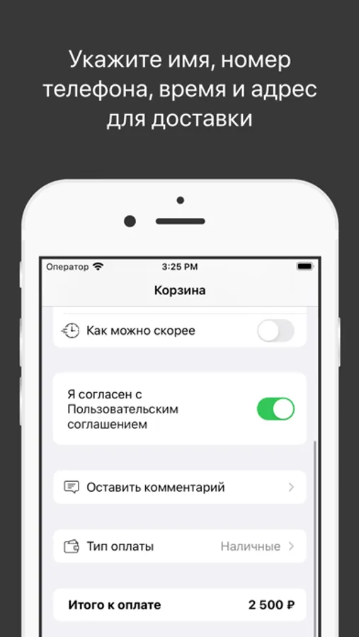 Укажите время, когда хотите прийти за своим заказом или выберите доставку с указанием времени и адреса доставки.